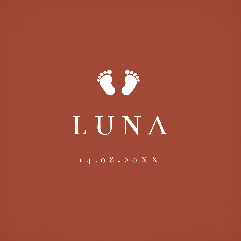 Lief geboortekaartje voor een meisje met roodbruine achtergrondkleur. De naam en het silhouet van kleine voetjes worden gedrukt in een goudfolie. Hierdoor krijgt de kaart een luxe uitstraling. Wist je dat je ook kunt kiezen voor bijvoorbeeld zilverfolie? Dit pas je eenvoudig zelf aan in de online editor samen met vele andere opties.