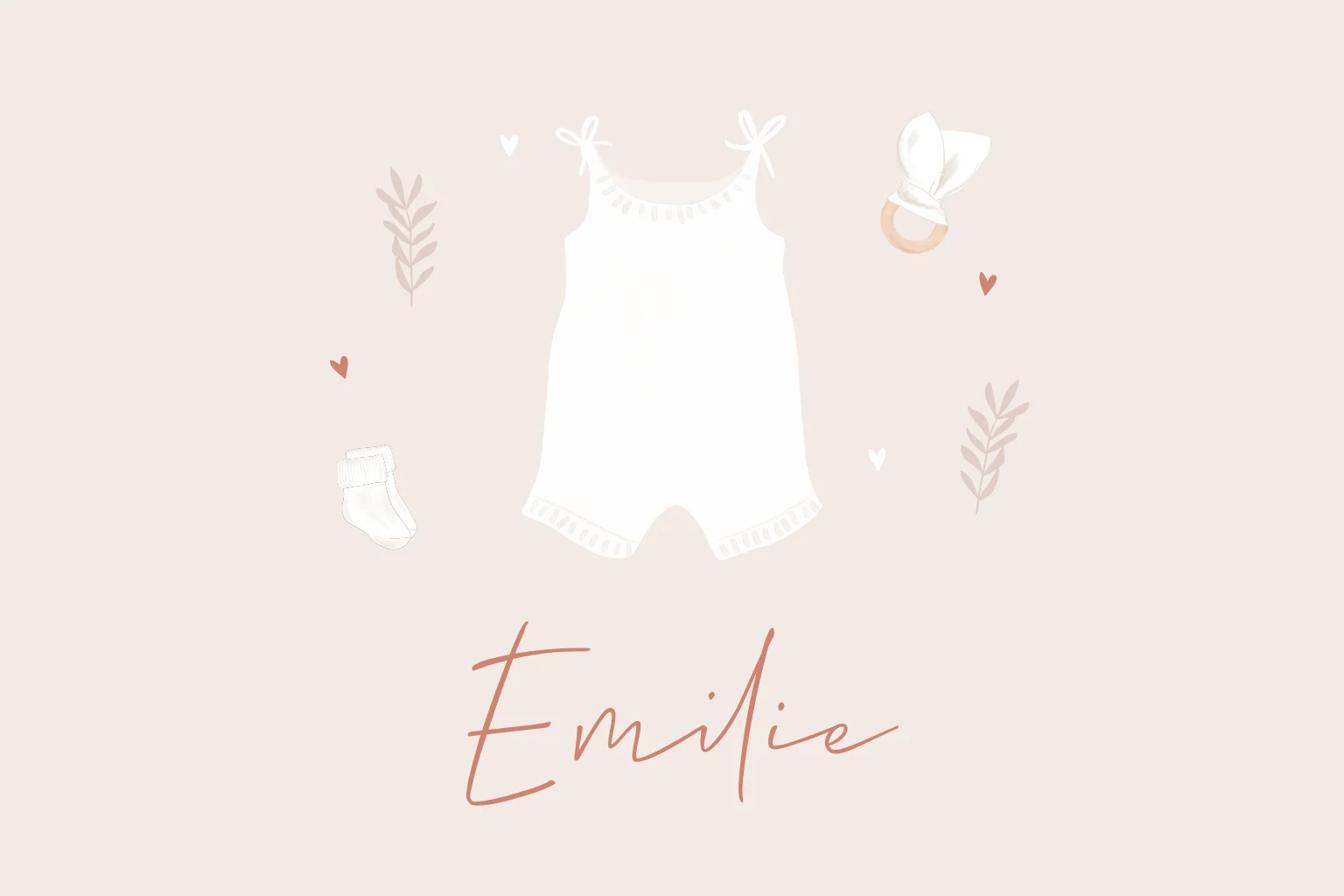 Hip lichtroze geboortekaartje voor jullie dochter. In het midden een wit rompertje met sokjes en takjes. Eronder de naam in oranje en de kleine hartjes in dezelfde kleur maken het helemaal af, lief!