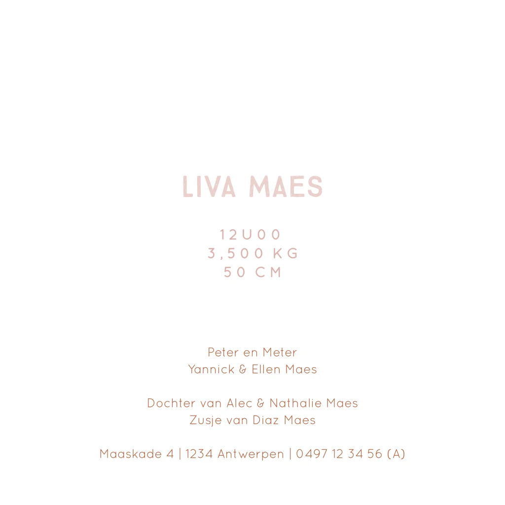 Een eenvoudig maar lief geboortekaartje voor een meisje. De naam is van roségoudfolie en is omringd door hartjes. Personaliseer het kaartje volledig naar eigen wens in de editor.