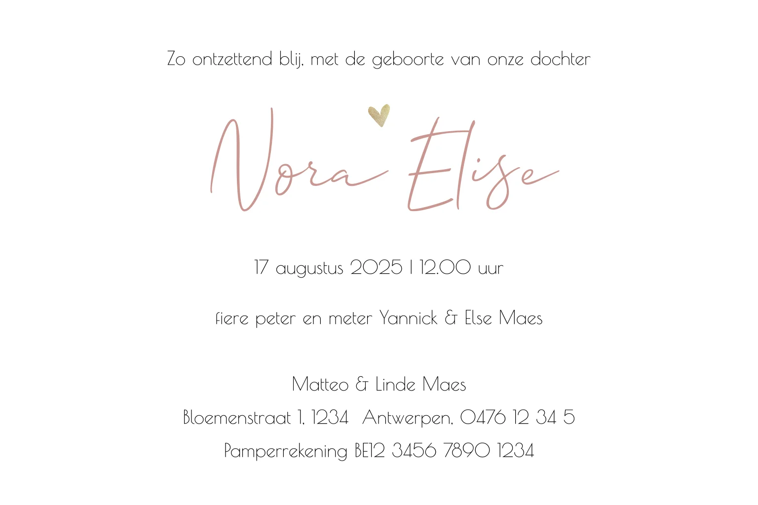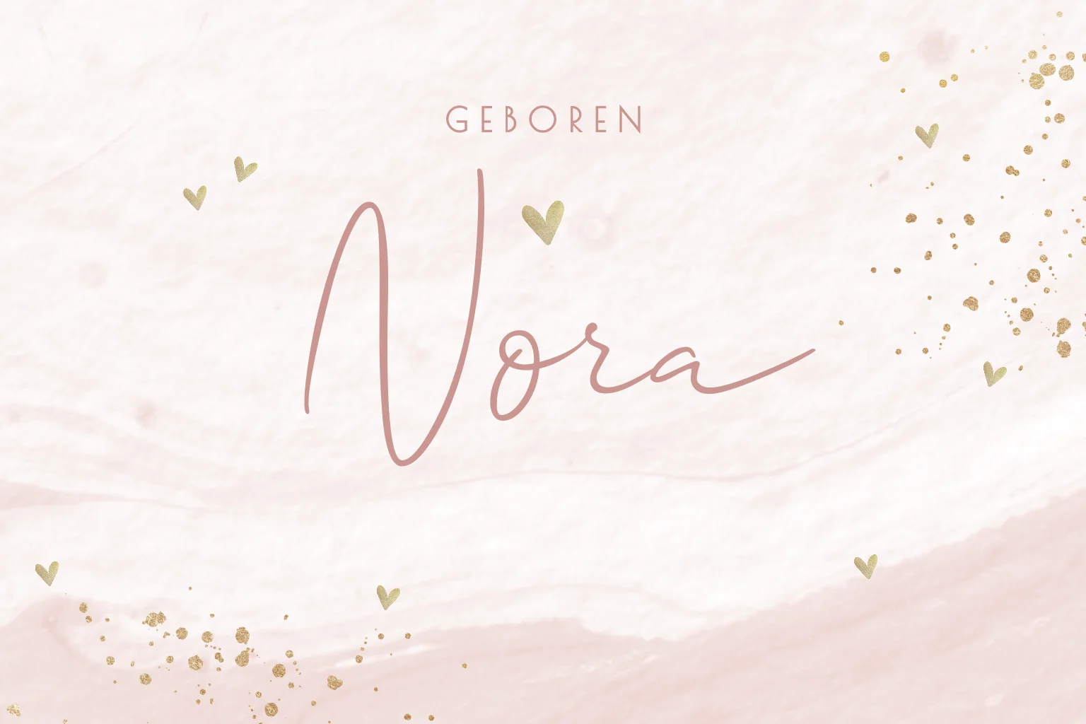 Een hip geboortekaartje in roze marmer-look. Op de achtergrond zie je spetters in goudkleur en hartjes.| Totaalprijs: 0 |
