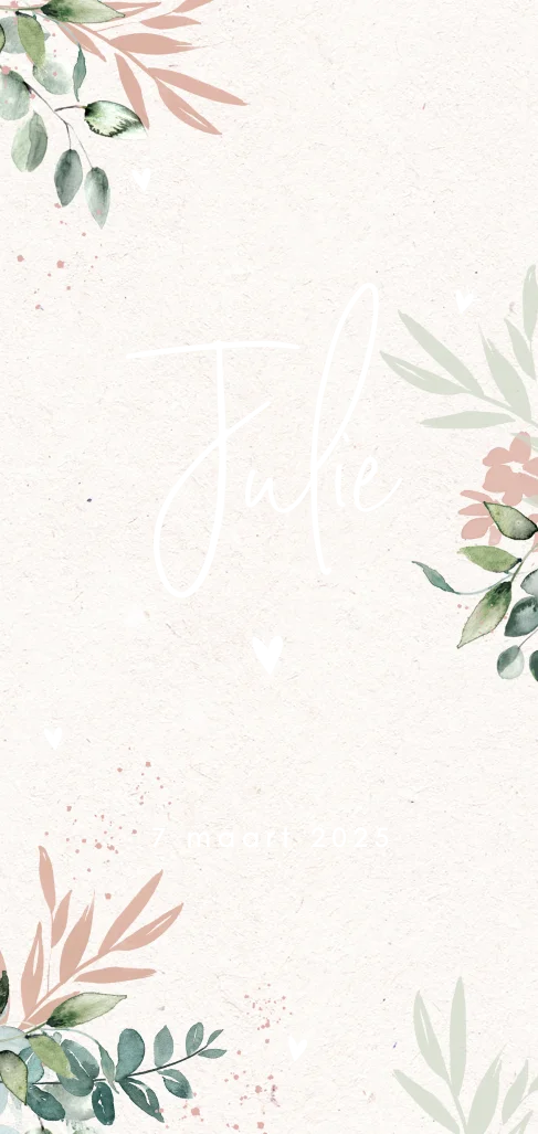 Een lief langwerpig geboortekaartje met verschillende takjes. De naam, datum en hartjes zijn van goudfolie. Maak het kaartje helemaal naar wens in de editor en kies voor een bijpassende enveloppe.Bekijk ook ons babyborrelkaartje.