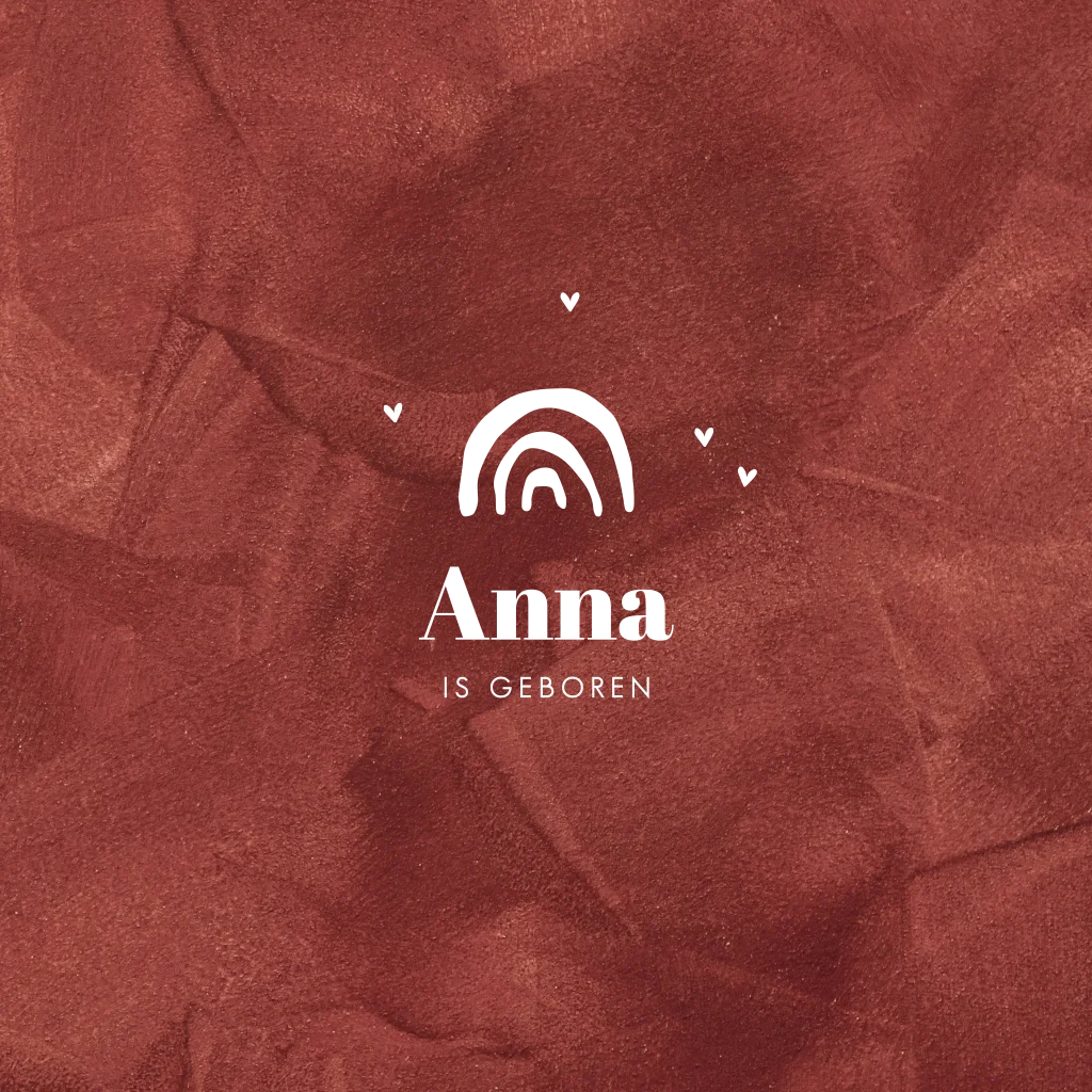 Een vierkant geboortekaartje met een achtergrond in rode velvet-look. Boven de naam staat een kleine regenboog afgebeeld met hartjes. Het kaartje is volledig naar eigen wens te personaliseren in de editor.
