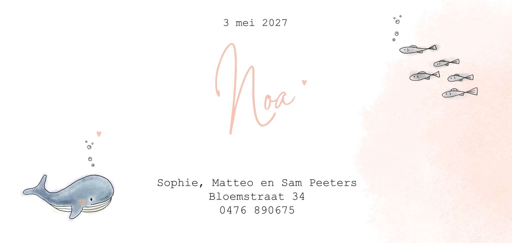Lief geboortekaartje zusje illustratie walvis en roze aquarel