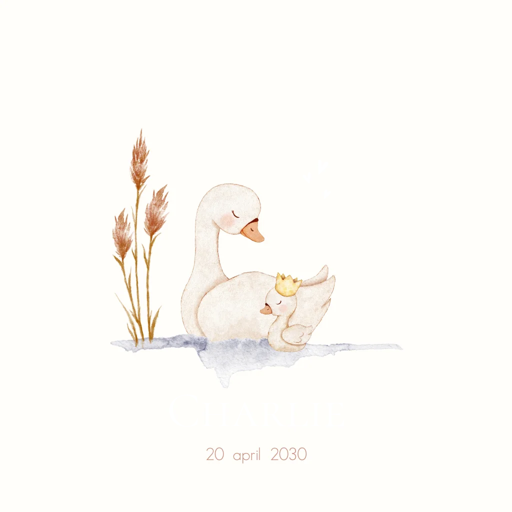 Een lief geboortekaartje voor jouw kindje. Het kaartje heeft een prachtige illustratie van een mama zwaan met haar kindje. De naam wordt gedrukt in goudfolie.