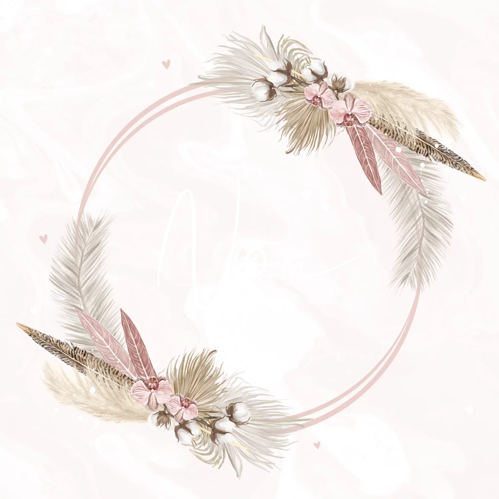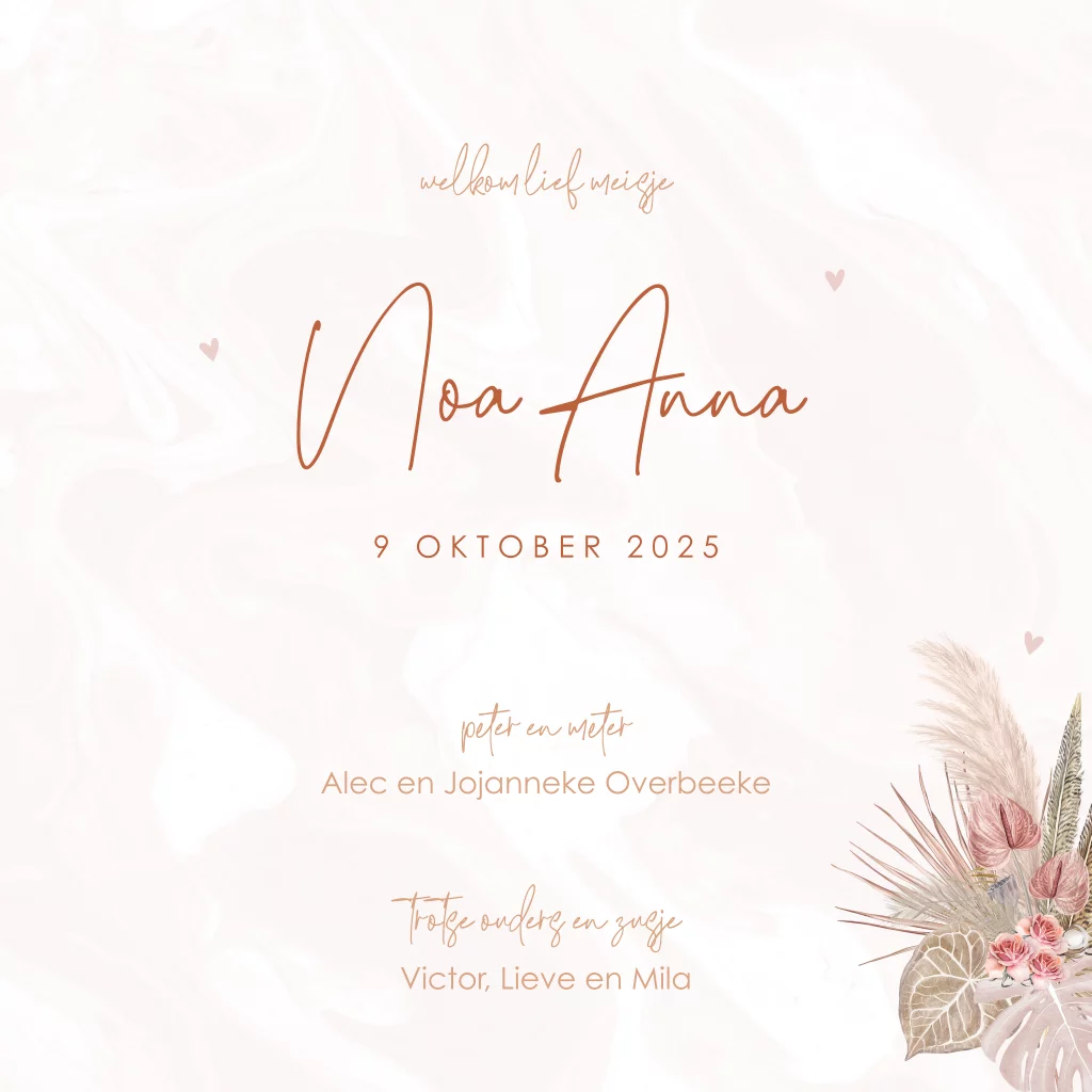 Een vierkant geboortekaartje met een bloemenkrans. Enkele details zijn van roségoudfolie. Personaliseer het kaartje volledig naar eigen wens in de editor.| Totaalprijs: 0 |