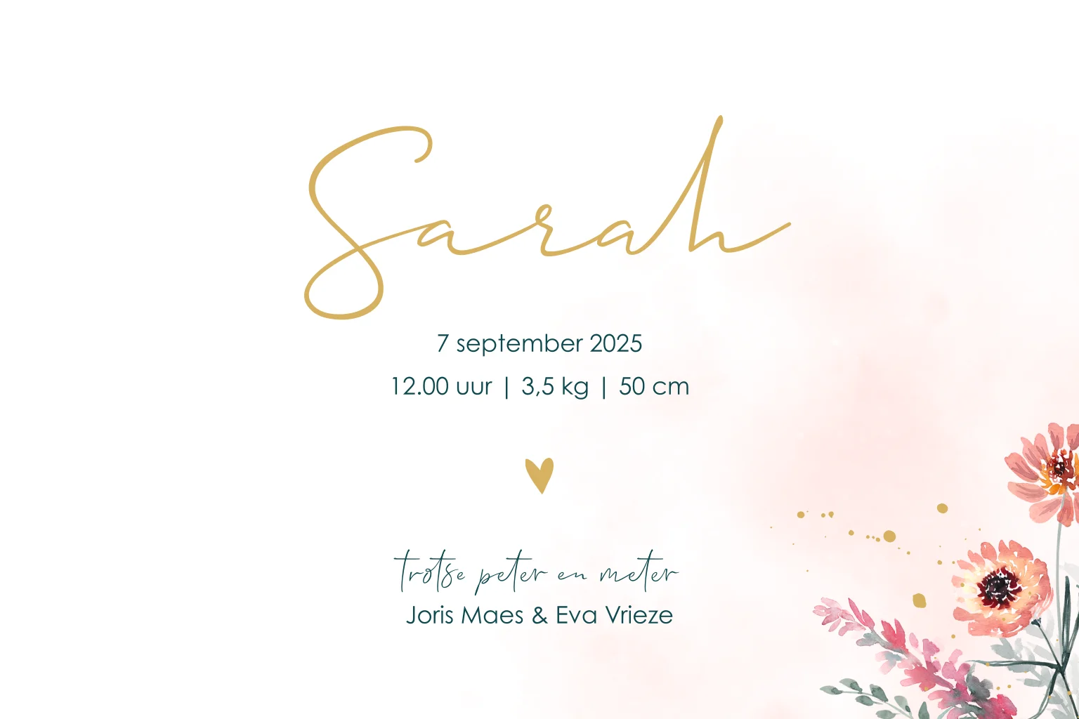 Een liggend geboortekaartje met roze bloemen en een klein vlindertje. Personaliseer het kaartje volledig naar eigen wens in de editor.| Totaalprijs: 0 |