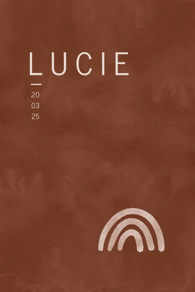 Een hip staand geboortekaartje met afgeronde hoeken in roestbruine watercolor. De naam van jullie kindje staat in trendy lettertype en onderaan staat een regenboog. Het ontwerp kan naar eigen wens worden aangepast in de online editor.| Totaalprijs: 0 |