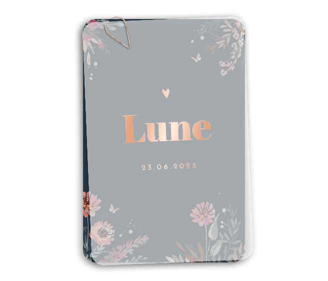 Bestel bij deze kaart het voorblad met de babynaam. Dit voorblad is gemaakt van transparant papier.