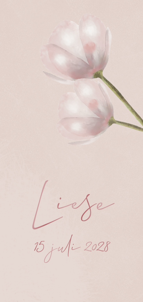Dit mooie en elegante geboortekaartje heeft 2 prachtige bloemen in watercolour stijl op een zachtroze achtergrond. Met de naam en datum in sierlijke hoogglans letters heeft deze kaart een romantische uitstraling.