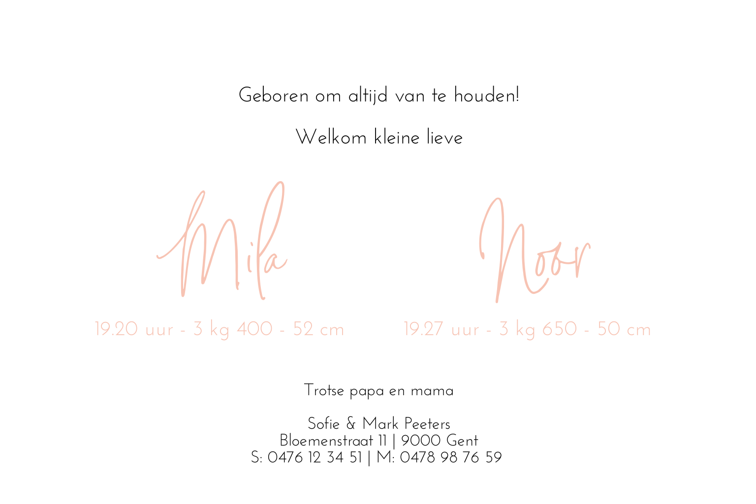 Schattig geboortekaartje met roségoudfolie voor de geboorte van jullie tweeling dochters. Op de achtergrond van roze watercolour staan hartjes in roségoudfolie.