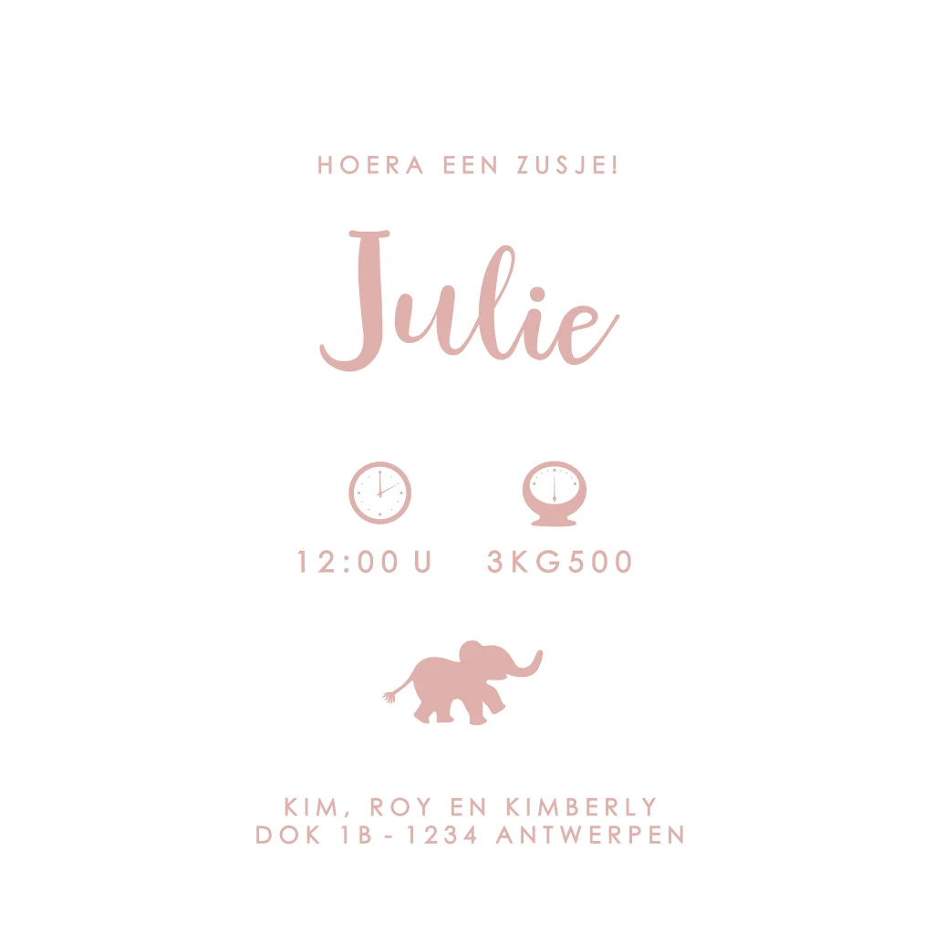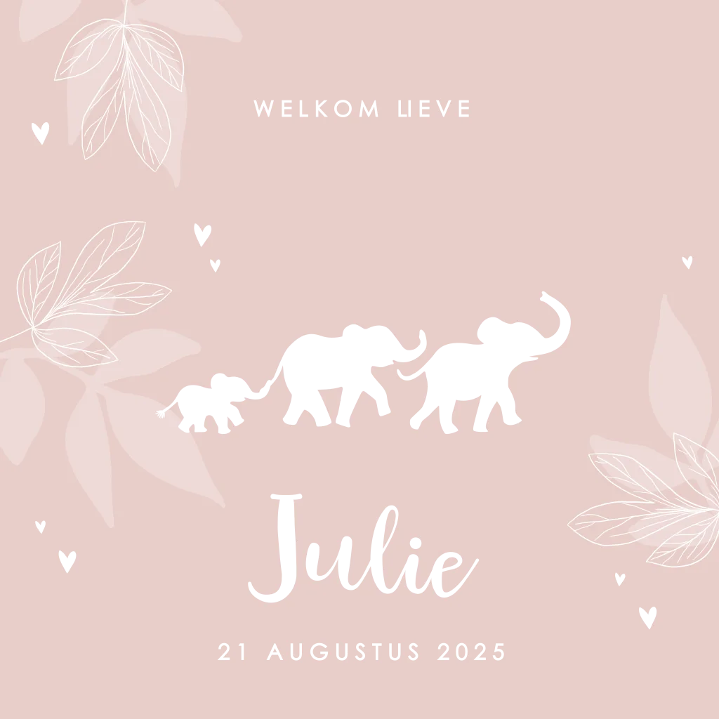 Hip geboortekaartje voor een meisje met een silhouet van drie olifantjes die achter elkaar aan lopen. De naam en het silhouet worden in een prachtige roségoudfolie gedrukt, wat erg mooie combineert met de oudroze achtergrondkleur. Op de kaart is ook een lichte lijntekening van bladeren te zien. Je kunt de kleuren en teksten eenvoudig zelf aanpassen in de online editor.