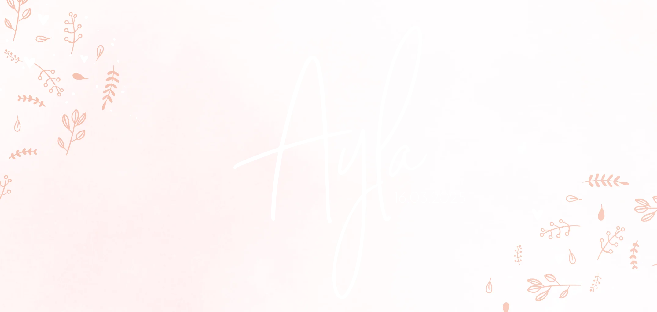 Dit mooie zachtroze babykaartje heeft op de voorkant de naam van jullie dochter in roségoudfolie. In de hoeken staan vrolijke hartjes, blaadjes, takjes op een vlak van waterverf.