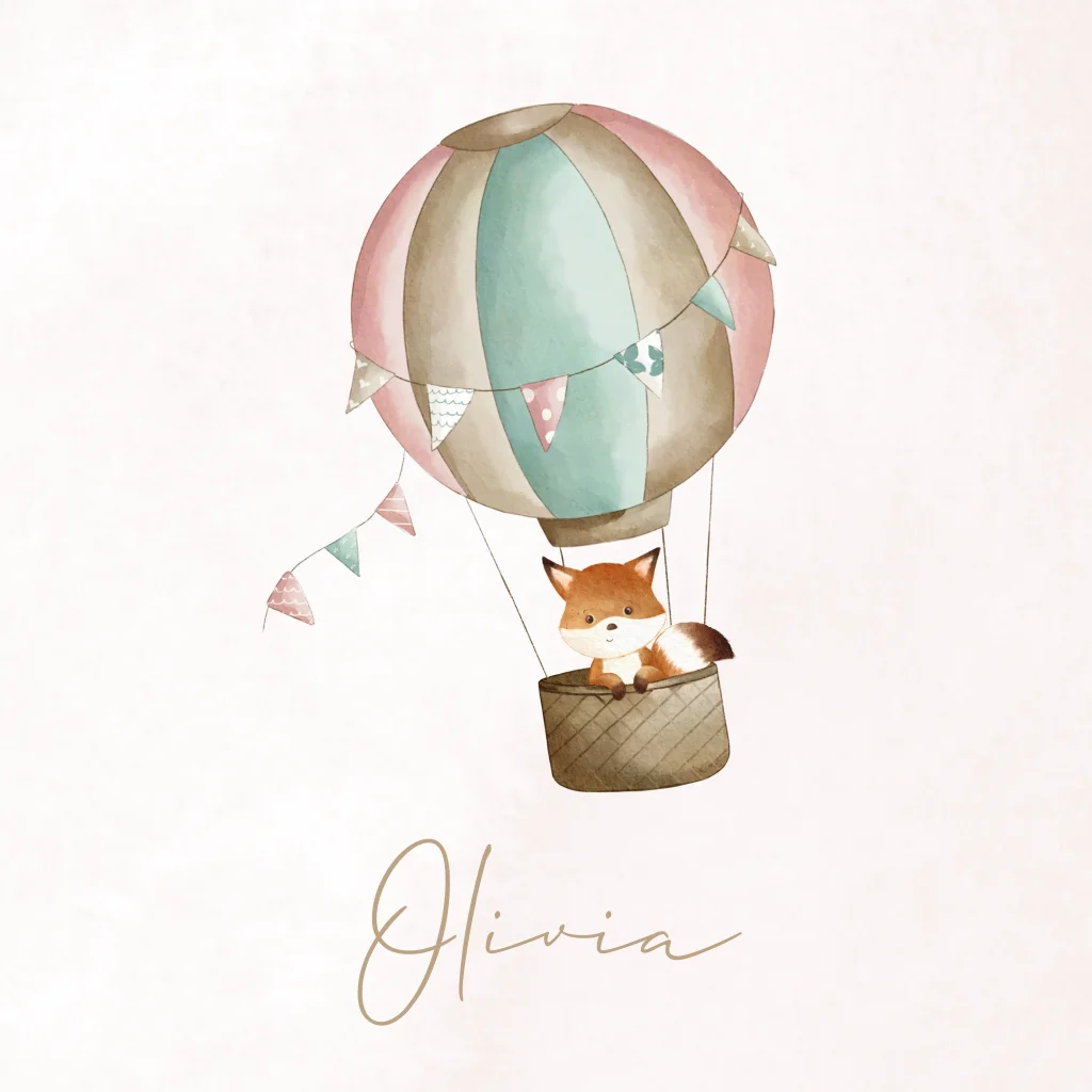 Schattig geboortekaartje meisje met vosje in luchtballon