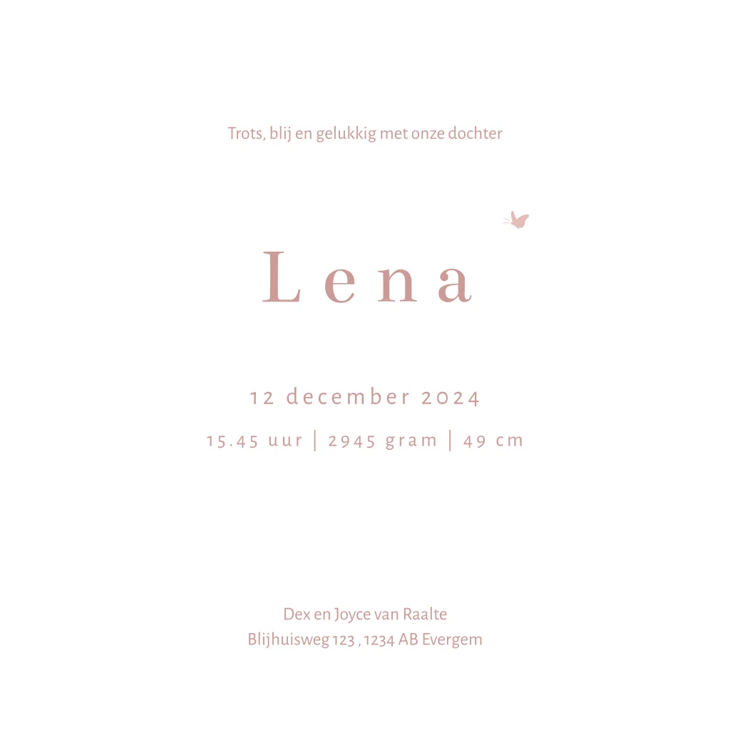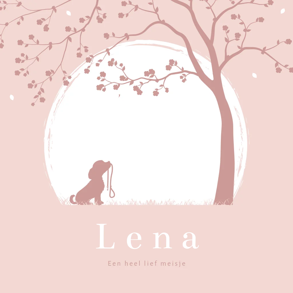 Schattig geboortekaartje voor de geboorte van jullie dochter. Het kaartje heeft een lief silhouet van een meisje op de schommel onder een boom, terwijl een klein hondje toekijkt. De tekst en het meisje worden in roségoudfolie gedrukt.