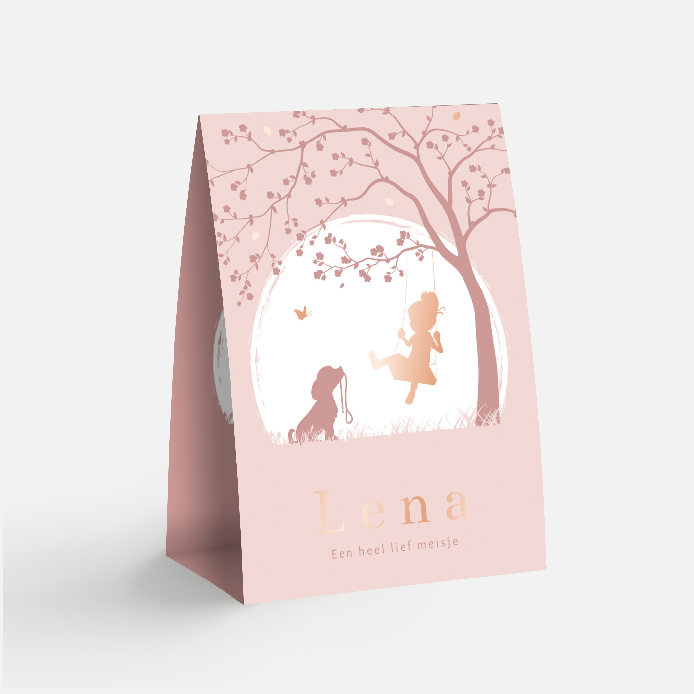 Tentkaartje voor geboorte meisje met silhouet en boom.