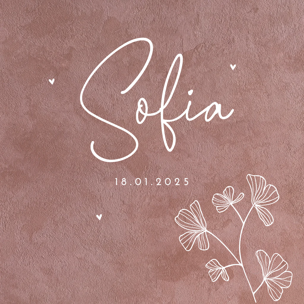 Hip velvet-look geboortekaartje in oud-roze kleur met tekening van een bloem en kleine hartjes. Tekst en tekening uitgevoerd in rosegoudfolie.