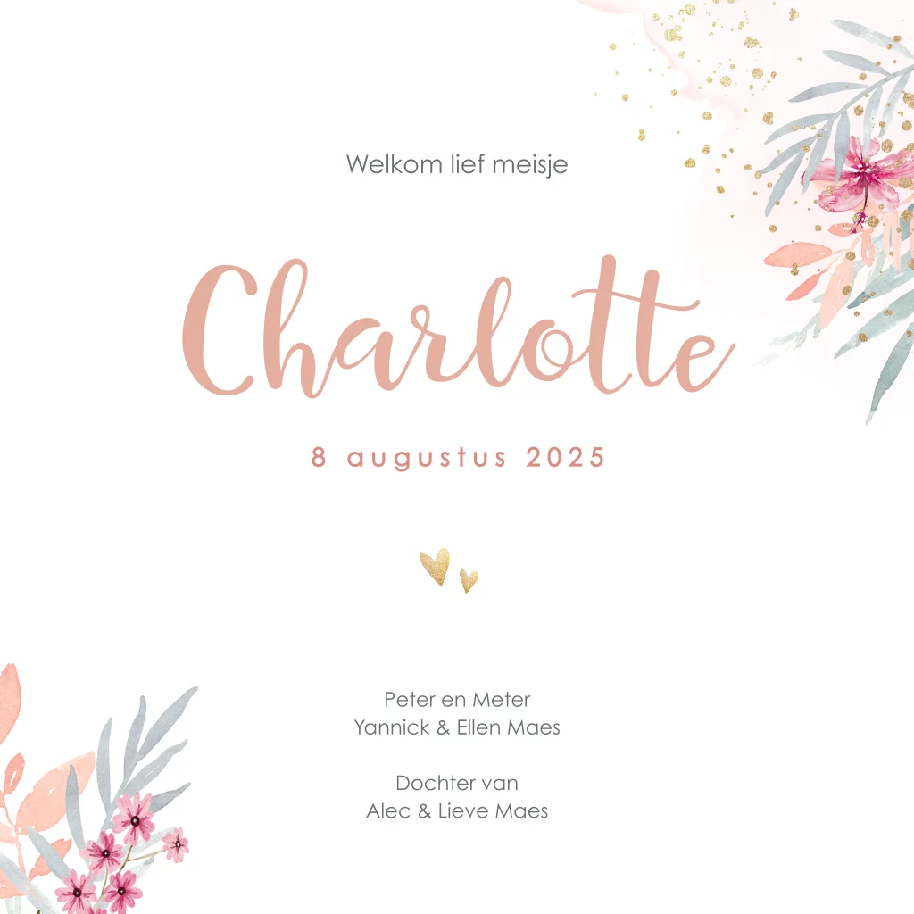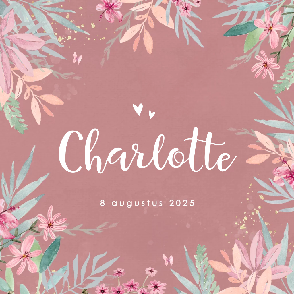 Een vierkant geboortekaartje met een bloemenrand. De achtergrondkleur is roze, maar kan worden aangepast in de online editor.