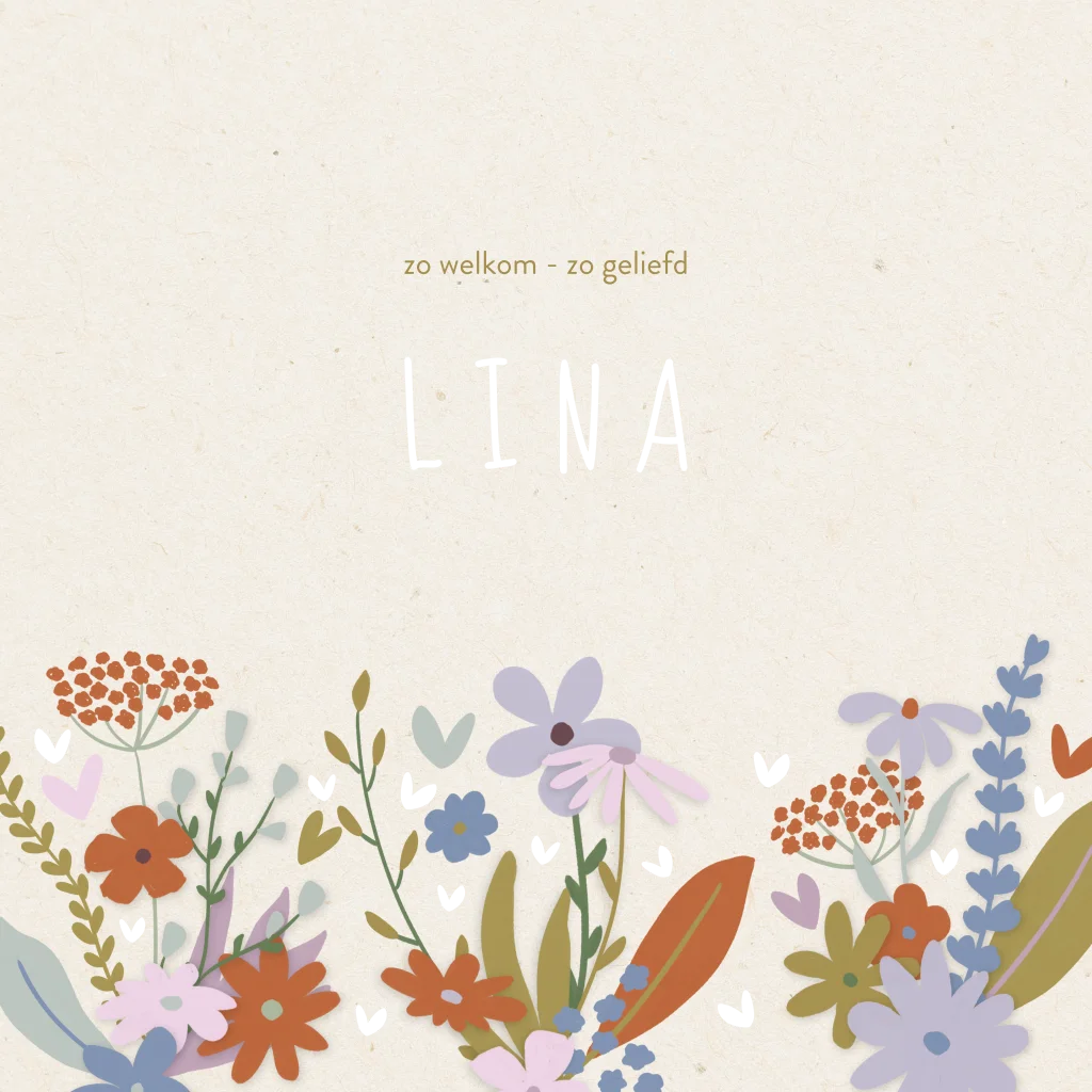 Schattig toch, dit geboortekaartje voor een meisje?! Op een pastelkleurige achtergrond staat een vrolijke bloemenrand onderaan in paars, roze en bruin. De naam staat in luxe goudfolie, op de achterzijde staat ook een bloemetje bij de tekst, pas deze naar wens aan in de online editor.
