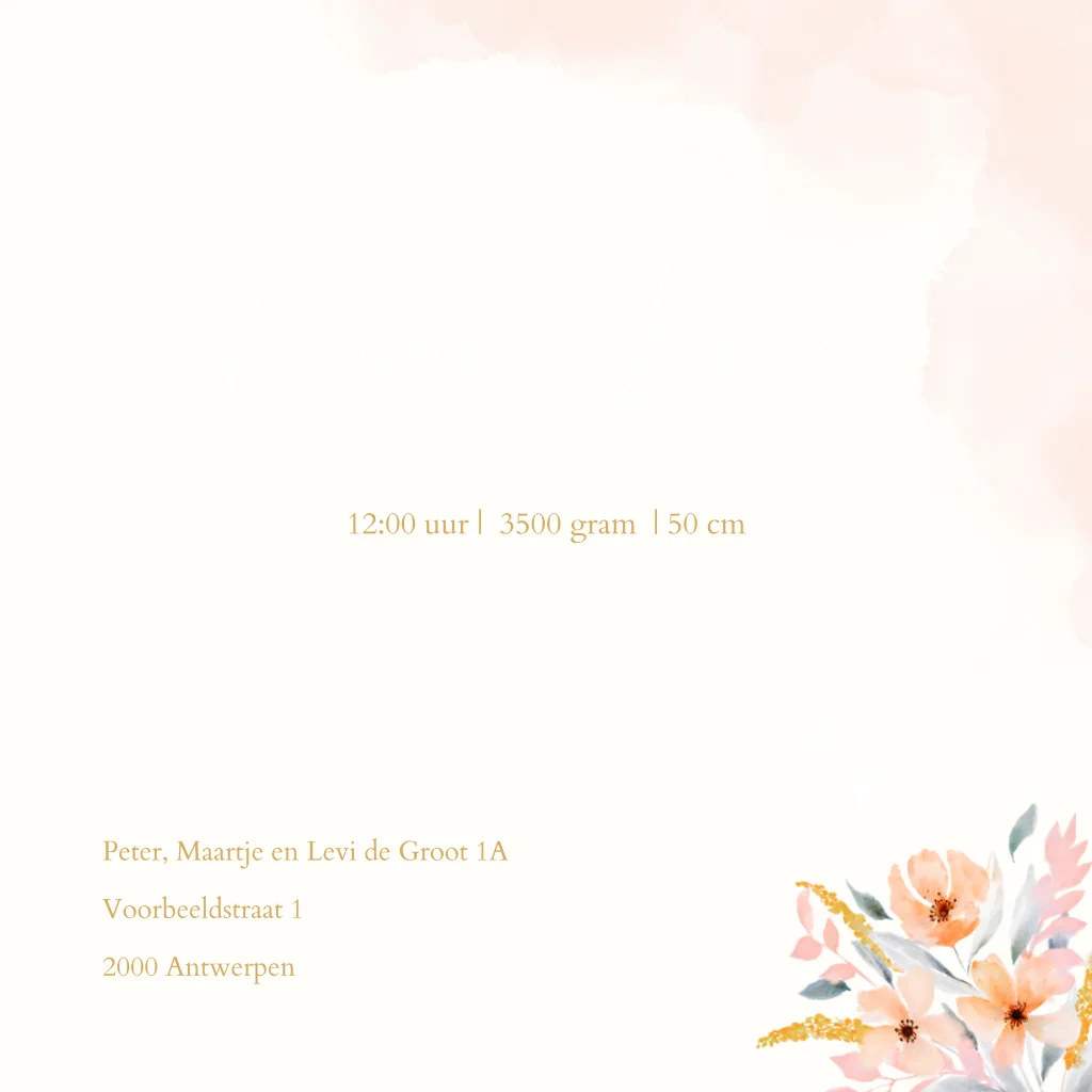 Dit romantische geboortekaartje met veldbloemen is met zorg en liefde getekend in een zachte aquarelstijl. De sierlijke bloemen in pasteltinten geven de kaart een lieflijke en natuurlijke uitstraling.