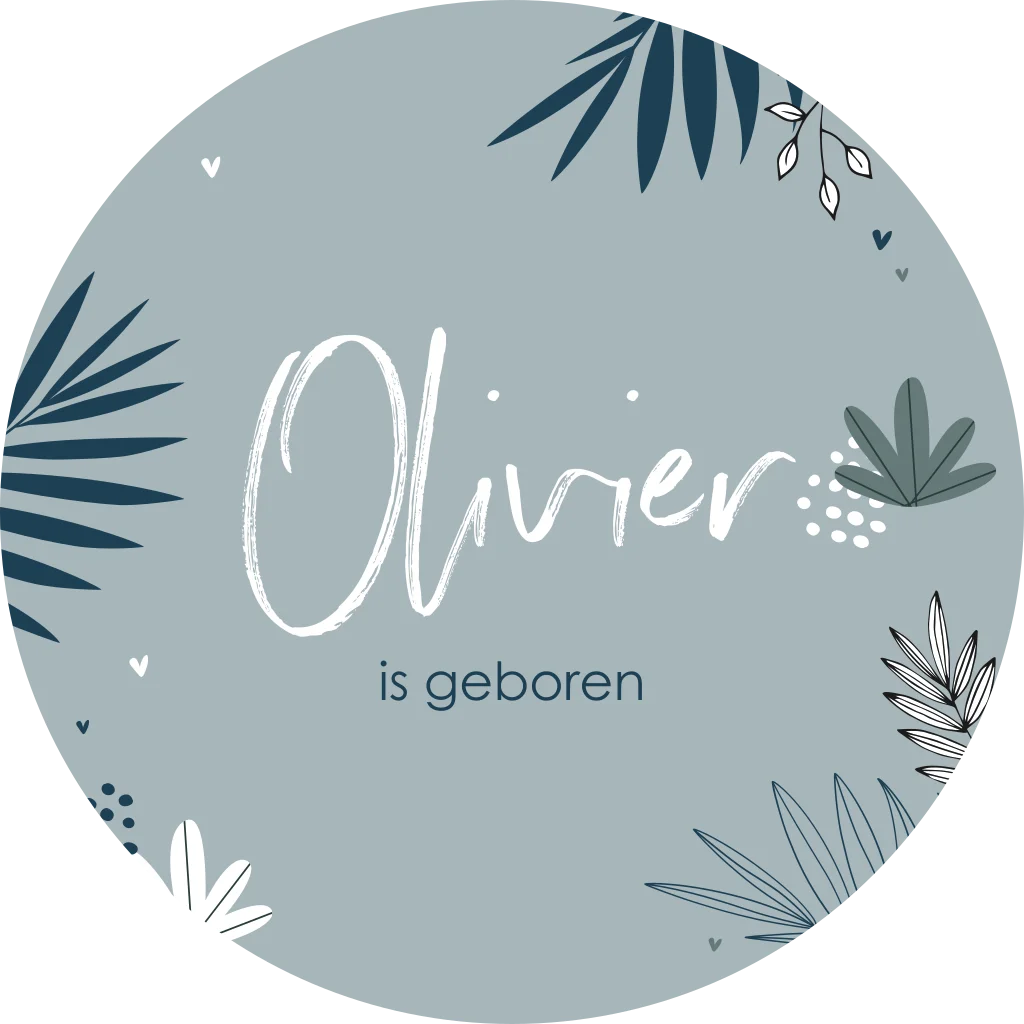 Hippe raamsticker in grijsblauw met botanische takjes in groen en moderne typografie. Personaliseer deze raamsticker naar eigen wens in de online editor.