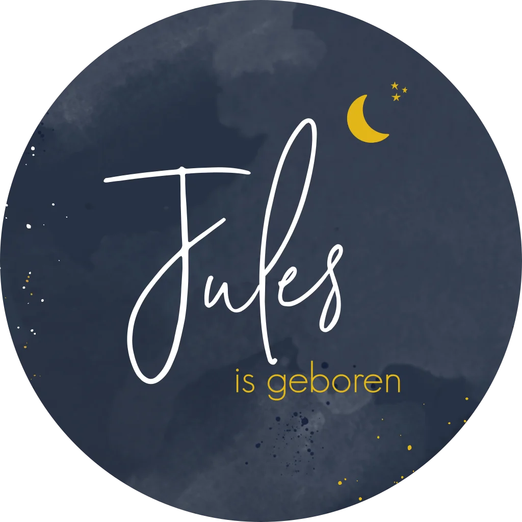 Donkerblauwe ronde raamsticker in watercolour met een maantje en sterren. De naam van jullie zoon in hippe letters maakt het helemaal af. Personaliseer de sticker naar eigen wens in de online editor.