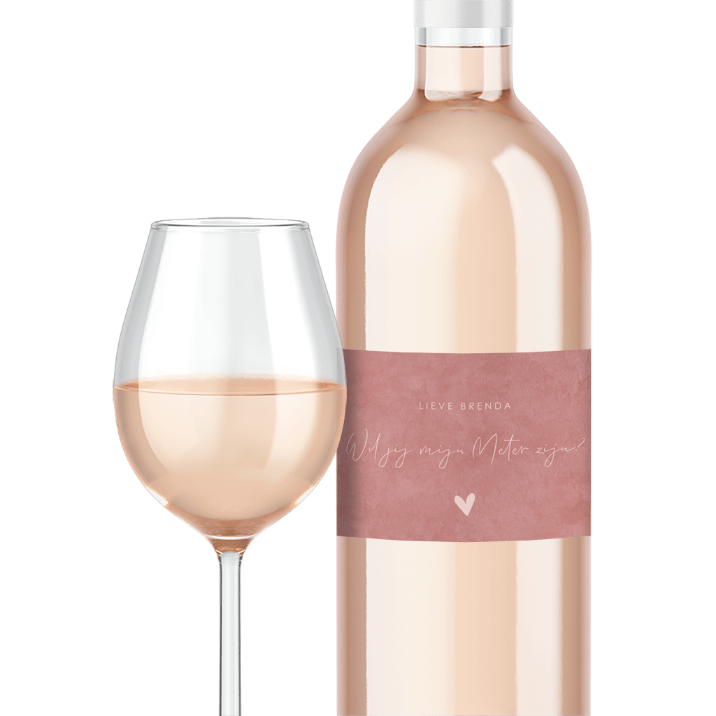 Een stijlvol fles etiket met een velvet-look achtergrond in het roze met de grote vraag voor meter. Onder de vraag staat een schattig hartje afgebeeld.