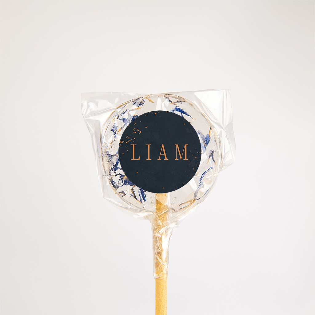 Met deze stijlvolle sticker plak je op snelle wijze de envelopjes dicht, in dezelfde stijl als het geboortekaartje wordt het een mooi geheel! De naam van de kleine staat in grote, moderne letters en de confetti op de donkerblauwe achtergrond maakt het meteen feestelijk!