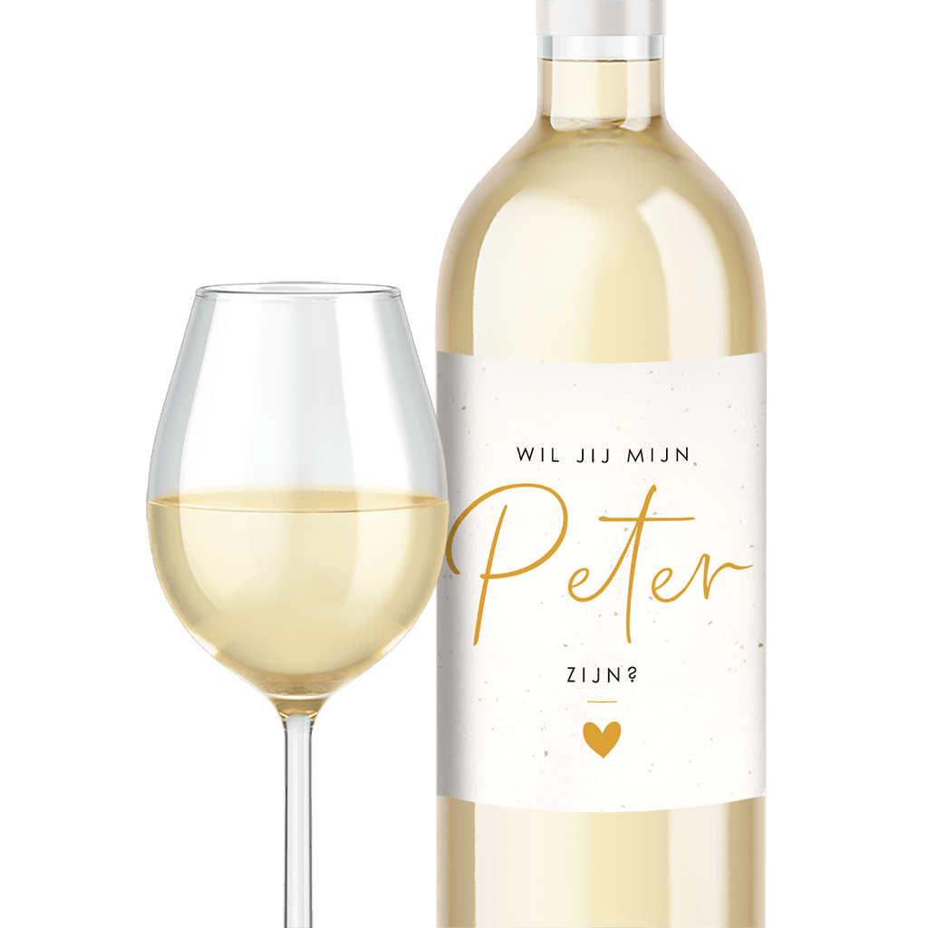 Wijnsticker voor op een wijnfles of andere fles om de grote vraag aan te kondigen aan je familielid of vriend(in). De sticker heeft sierlijke letters en een lichte achtergrond.