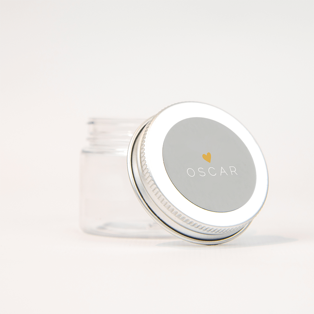 Bijpassende sticker bij het geboortekaartje, voor doopsuikers of de envelopjes mee te sluiten, op de grijze sticker staat een oranje hartje boven de naam in witte letters. Afmeting