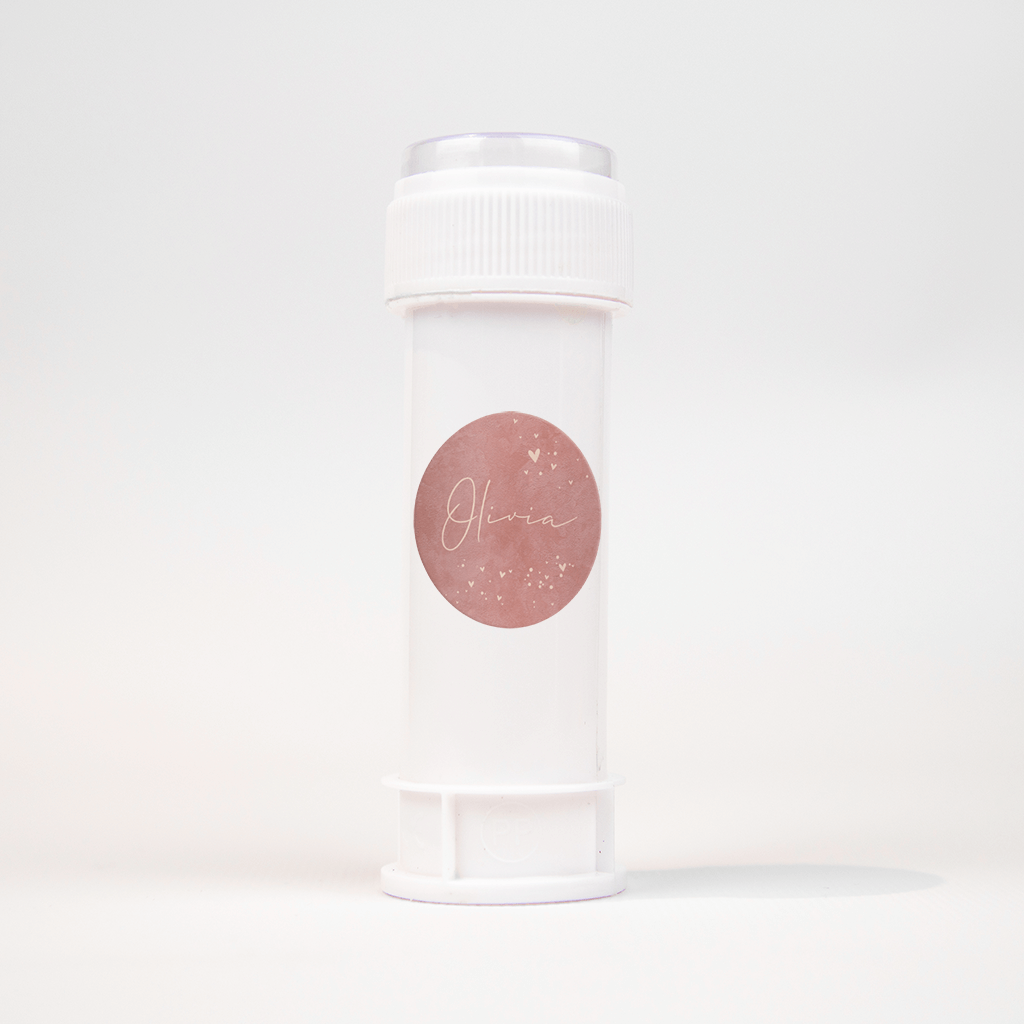 Een sticker met de naam van jullie dochtertje in het midden. Om de naam van jullie kindje staan lieve kleine hartjes. De sticker heeft een roze velvet-look achtergrond.