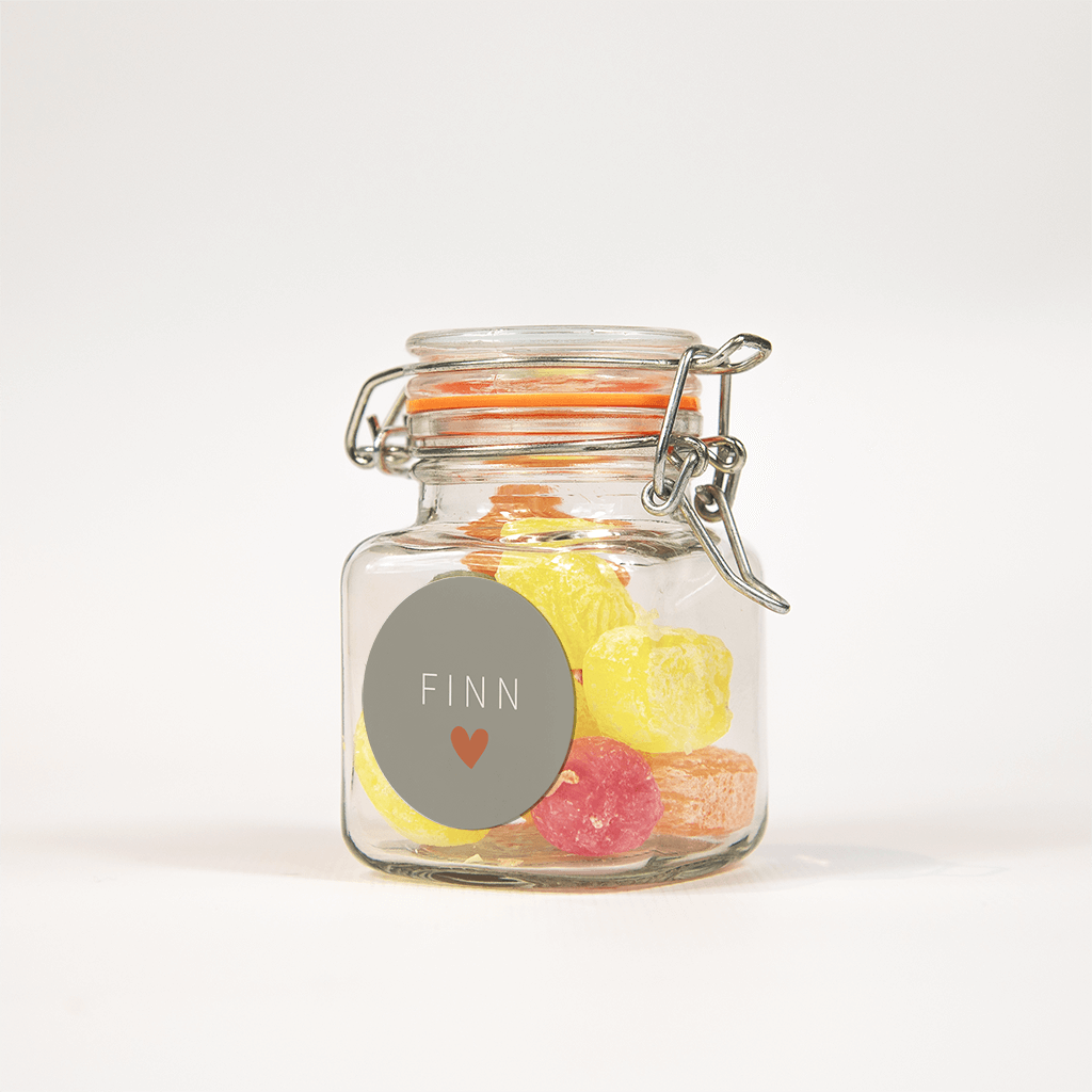 Mooie bijpassende sticker bij het grijze geboortekaartje, de naam staat in strakke witte letters op een grijsbruine achtergrond, eronder een lief oranje hart. Per vel 25 stickers van Ø 35 mm.