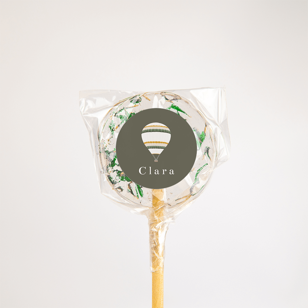 Coole bijpassende sticker bij het geboortekaartje, met een luchtballon met witte, gele en groene strepen op een donkergroene achtergrond. Leuk voor de doopsuikers of om de envelopjes mee te sluiten. Per vel 25 stickers, afmeting
