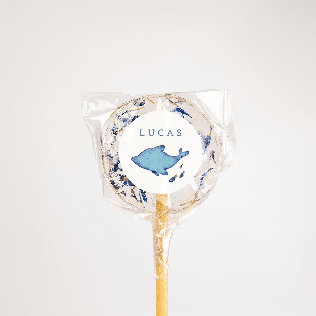 Ronde naamsticker in wit met een leuke illustratie van een blauwe vis met drie kleine visjes ernaast, per vel 25 stickers.| Totaalprijs: 0 |
