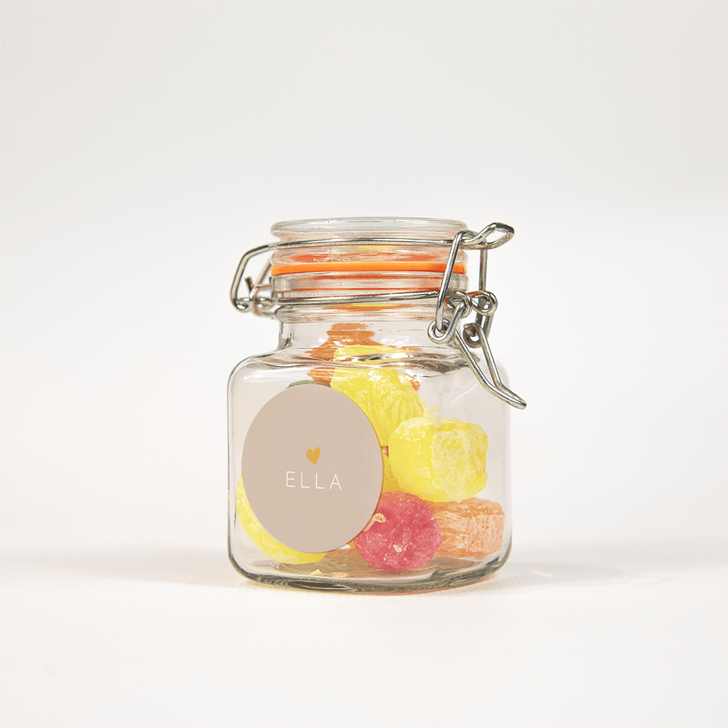 Mooie bijpassende sticker bij het geboortekaartje voor de doopsuikers of om de envelopjes mee te sluiten. Op een peachkleurige achtergrond staat een lief oranje hartje boven de naam in witte letters.