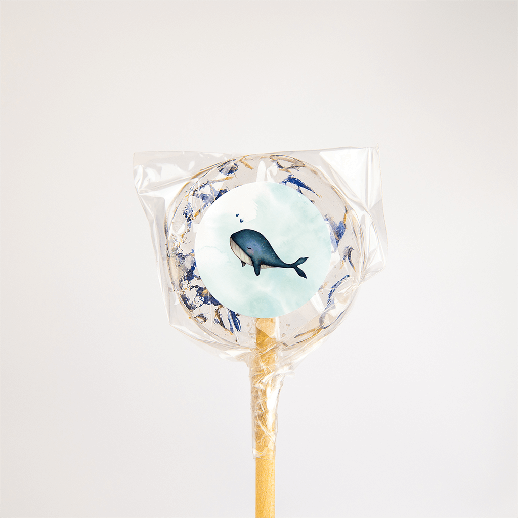 Op deze witte sticker zwemt een superlief aquacolour walvisje in een blauwe zee van aquarel met twee hartjes erboven.