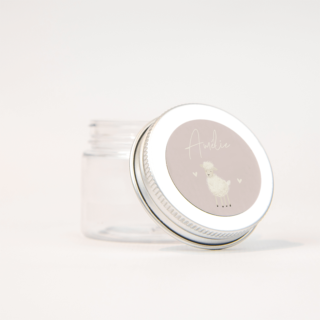 Een zachtroze sticker met daarop een lief schaapje en daarboven de naam van jullie dochtertje. Om het schaapje staan lieve hartjes.| Totaalprijs: 0 |