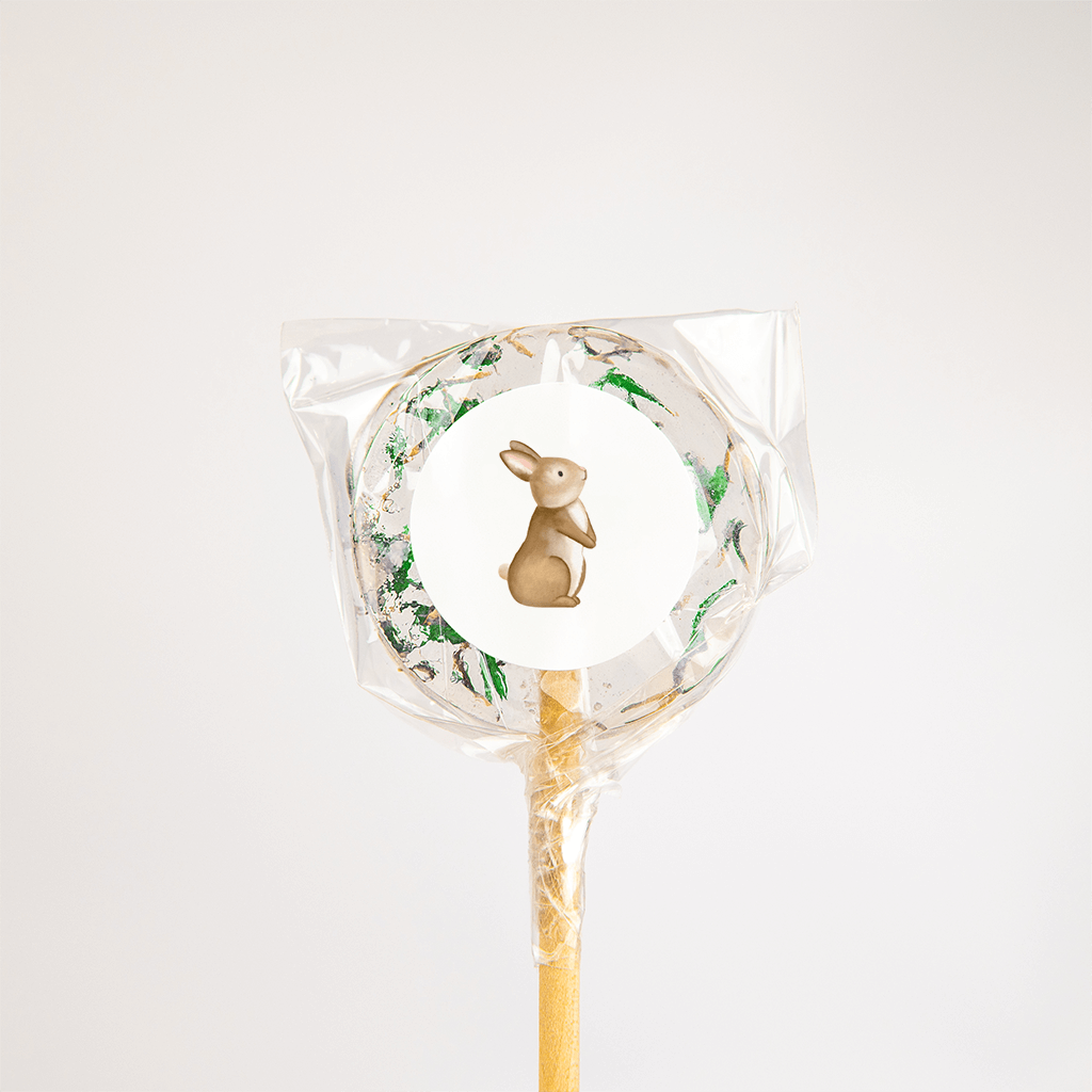 Bijpassende geboortesticker in het bosdierenthema, op een witte achtergrond zit een klein lief konijntje.