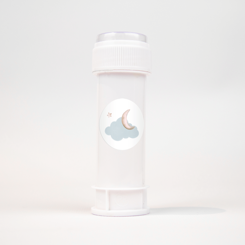 Bijpassende sticker bij het geboortekaartje met de beer op een wolk. Op de witte achtergrond zie je een lichtblauwe wolk met een roze maan en een sterretje erboven.