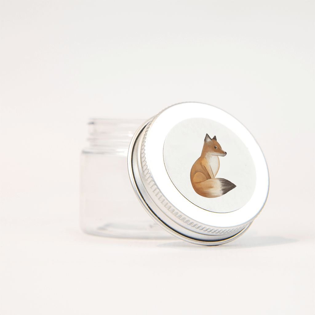 Deze sticker past perfect bij het geboortekaartje voor een jongen met de naam in grote letters en bosdieren. Op de witte achtergrond staat een grappig vosje getekend.
