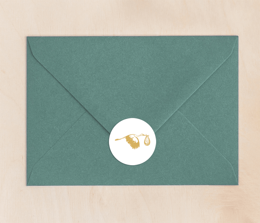 Maak je geboortekaartje compleet met deze mooie sluitzegel in wit en goudkleur. Op de sticker staat een ooievaar met baby. Past goed bij de kaart met de maan en dezelfde ooievaar.