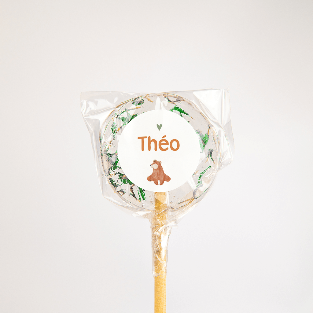 Dat is nog eens trendy: een sticker in de stijl van jullie geboortekaartje! De naam van de kleine staat in hippe letters boven het bruine beertje en het kleine hartje zorgt voor een lief accent. Een mooie manier om de envelopjes te sluiten of een leuke versiering voor de doopsuikers!
