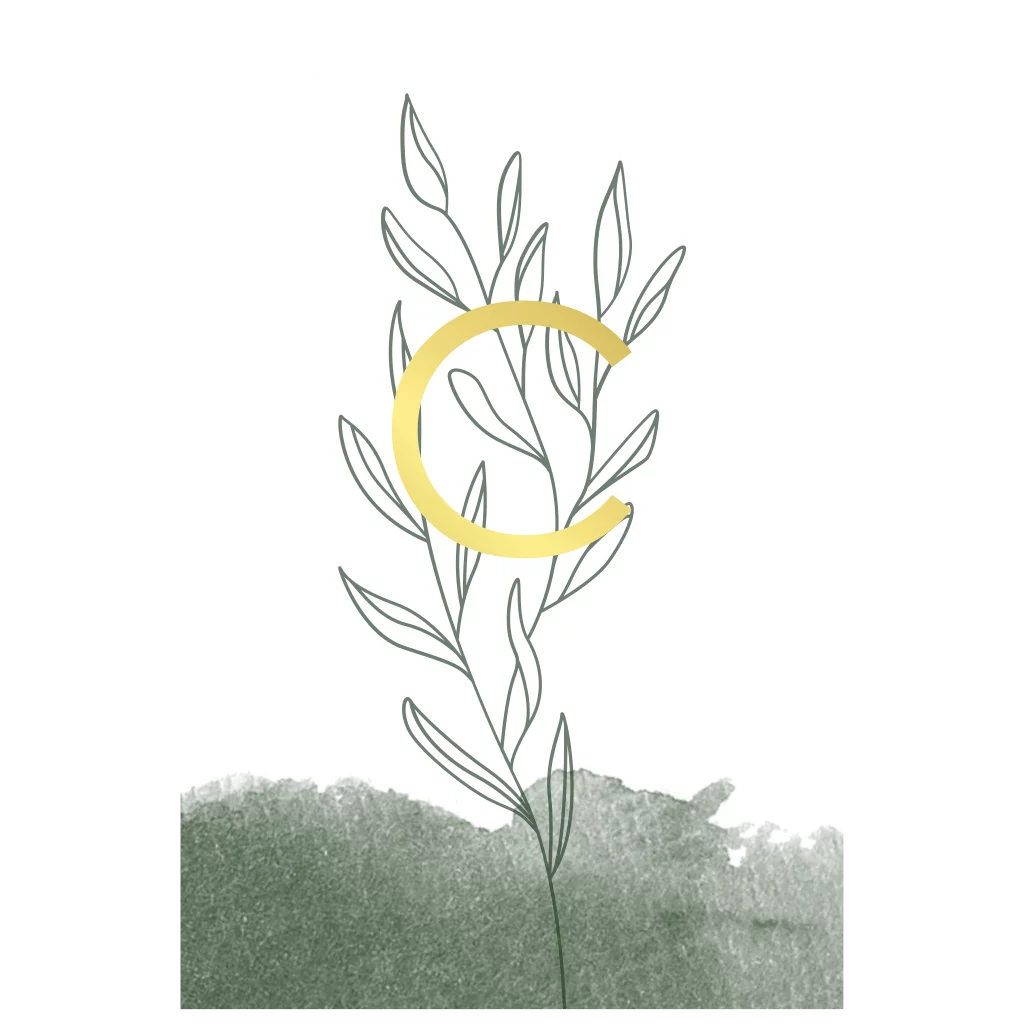 Sticker in een bijzonder vorm met een initiaal in goudfolie. De achtergrond met groene waterverf en een getekend takje maken dit een chique en hippe sticker om bijvoorbeeld bij doopsuikers te gebruiken.