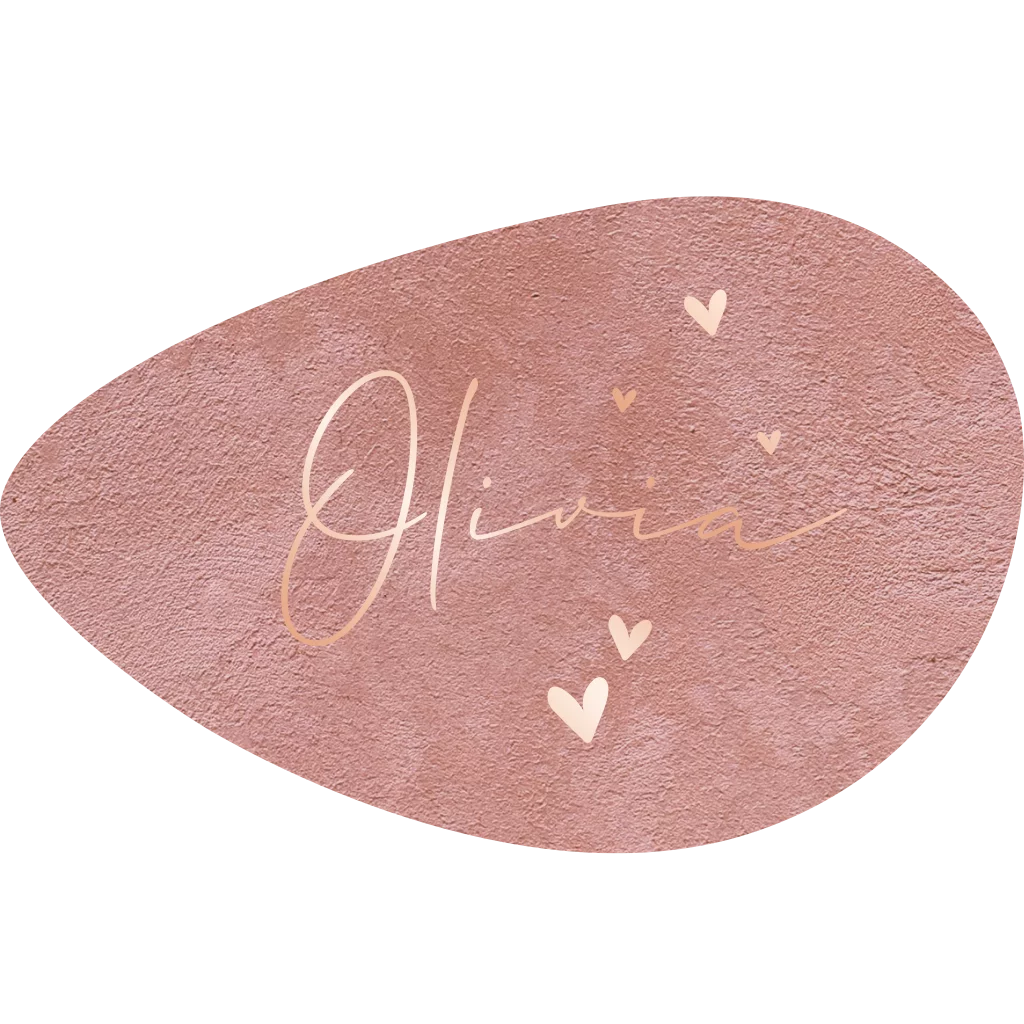 Deze schattige sticker in een bijzondere vorm heeft een roze velvetlook achtergrond en de naam staat samen met schattige hartjes in roségoudfolie.