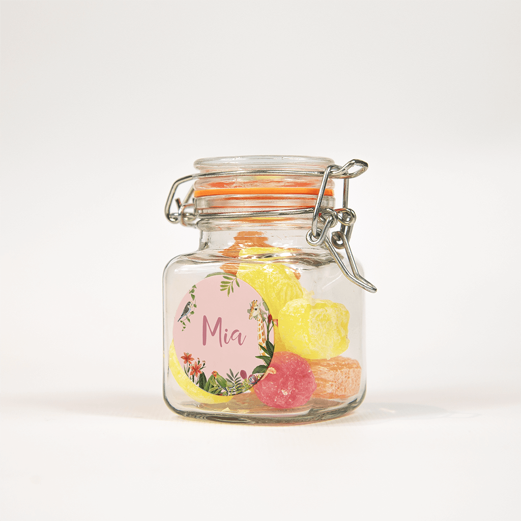 Leuke kleurrijke sticker in dezelfde jungle-stijl als het geboortekaartje van jullie dochter. Op een roze achtergrond staat de naam in het midden, langs de rand staan verschillende dieren tussen de jungle bladeren. Een mooie sticker waarmee je eenvoudig de envelopjes van het geboortekaartje kunt sluiten, echt uniek!