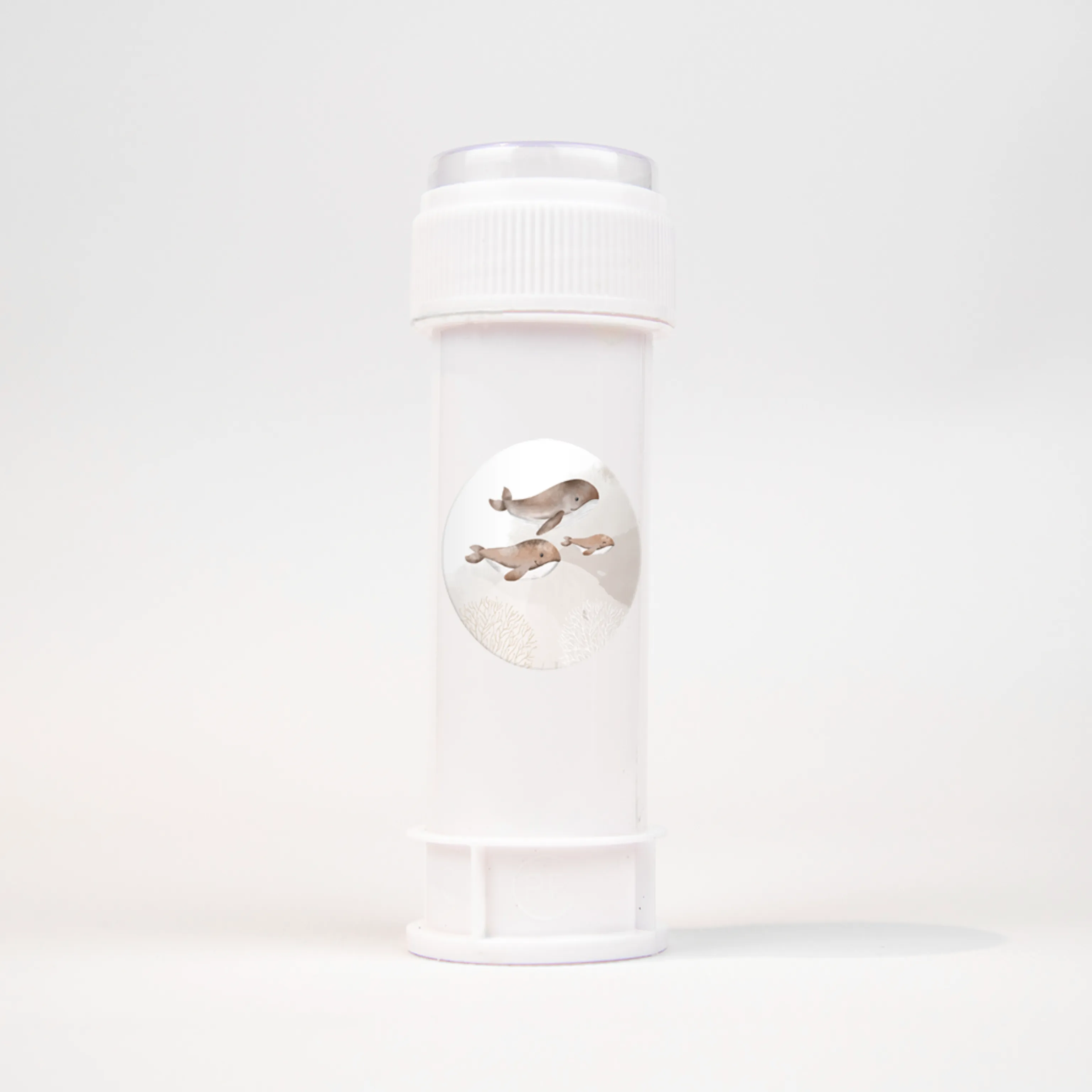 Ronde naamsticker in neutrale kleuren met leuke illustraties van 3 walvissen, per vel 25 stickers.