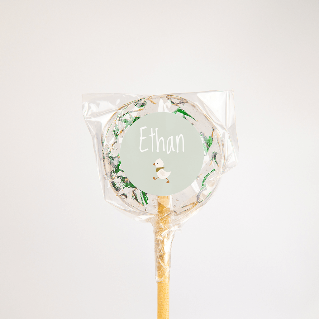 Een mooie sticker voor bij het geboortekaartje van jullie zoontje! Op een pastelkleurige achtergrond staat de naam van de kleine in trendy letters centraal, eronder een grappig kuiken met een doekje om de nek, superschattig!