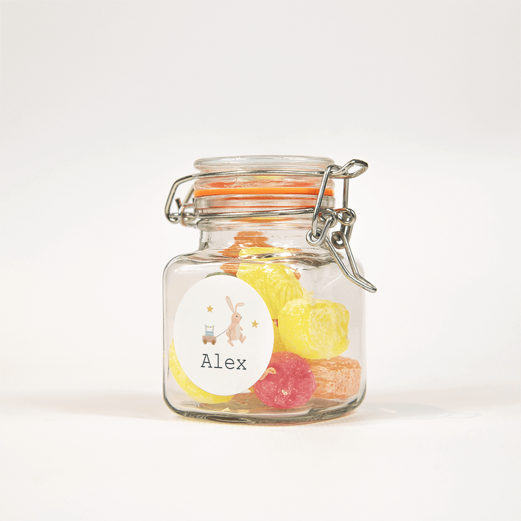 Sticker met getekend konijntje en speelgoed autootje - per vel van 25 stickers