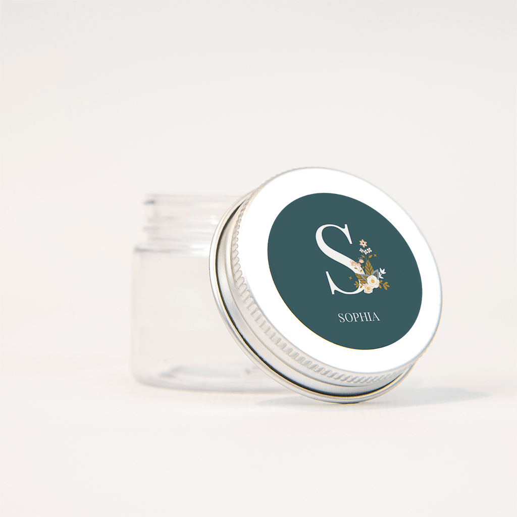 Leuke geboortesticker voor een meisje met een stoer groot wit initiaal op blauwgroen! Langs de letter een lief boeketje bloemen in roze en wit. De naam staat in trendy witte letters eronder en deze pas je eenvoudig zelf aan in de editor.