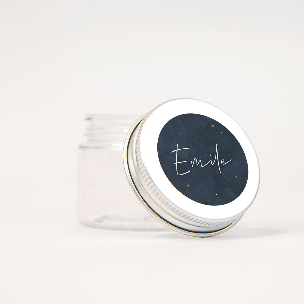 Deze sticker past perfect bij het chique donkerblauwe geboortekaartje! De naam staat in een sierlijk lettertype centraal op de donkere velvetlook achtergrond en de kleine hartjes zorgen voor een lief accent.