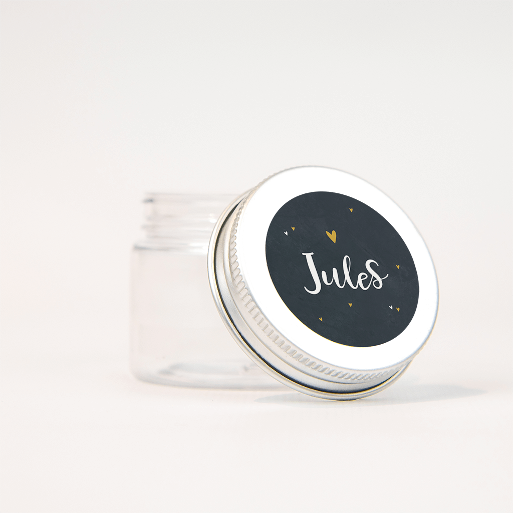 Op deze zwarte sticker komt de naam van jullie zoontje in het trendy lettertype mooi naar voren. De kleine hartjes in wit geven een lieve touch. Met deze sticker maak je jullie geboortekaartje helemaal compleet!